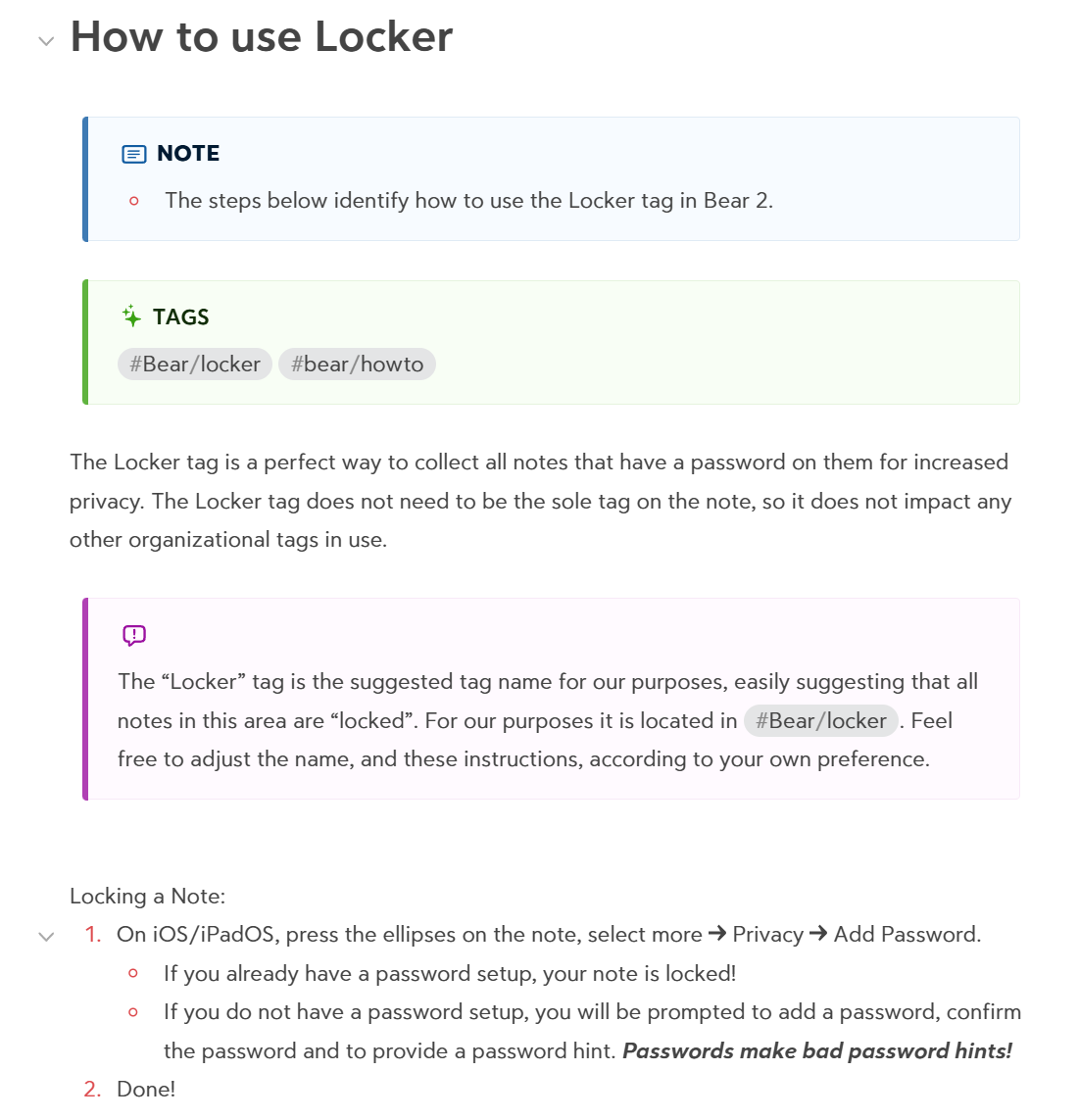 The Locker template and related tag will organize all your password-protected notes into a “Locker” of sorts to make categorization easy. The Template guides you in using this feature.
